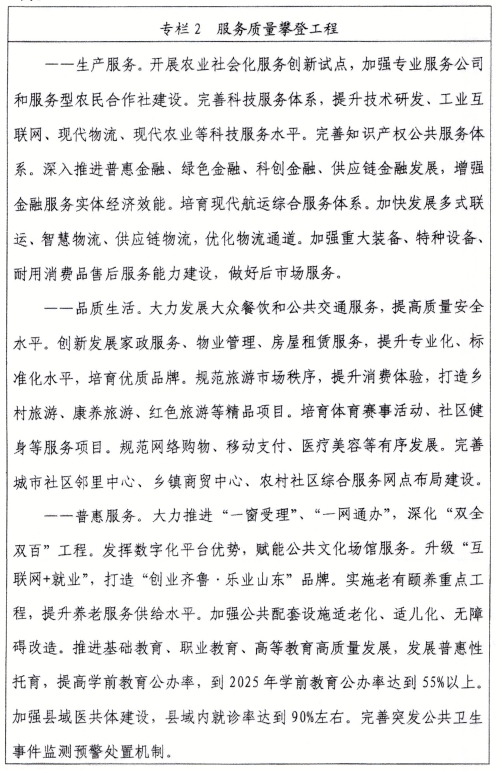 (十)推動服務業(yè)擴容提質(zhì)。深化服務業(yè)供給側(cè)結(jié)構(gòu)性改革,支持傳統(tǒng)服務行業(yè)改造升級,大力培育服務業(yè)新產(chǎn)業(yè)、新業(yè)態(tài)、新模式,加快發(fā)展現(xiàn)代服務業(yè),著力提高服務效率和服務品質(zhì),持續(xù)推進服務領域改革開放,努力構(gòu)建優(yōu)質(zhì)高效、布局優(yōu)化、競爭力強的服務產(chǎn)業(yè)新體系。以創(chuàng)新、標準、品牌、滿意度監(jiān)測等理念方法引領服務質(zhì)量提升發(fā)展,助力產(chǎn)業(yè)鏈向價值鏈高端延伸。開展優(yōu)質(zhì)服務標準建設行動,健全服務業(yè)質(zhì)量標準體系,實施服務業(yè)標準化試點示范,推行優(yōu)質(zhì)服務承諾、認證、標識制度,培育一批具有競爭力的優(yōu)質(zhì)服務市場主體和知名品牌。在物流、商務咨詢、檢驗檢測等生產(chǎn)性服務領域,開展質(zhì)量標桿企業(yè)創(chuàng)建行動;在大眾餐飲、家政服務、物業(yè)管理、房屋租賃、旅游等生活性服務領域,開展服務質(zhì)量滿意度提升行動;圍繞城鄉(xiāng)居民優(yōu)質(zhì)便利生活需要,合理布局便民服務設施,持續(xù)增強城鄉(xiāng)教育、養(yǎng)老服務、基本醫(yī)療、文化體育、口岸公共衛(wèi)生等領域公共服務能力,加快數(shù)字政府、數(shù)字社會、智慧城市、數(shù)字鄉(xiāng)村建設,構(gòu)建優(yōu)質(zhì)均衡的公共服務體系。加大服務質(zhì)量監(jiān)管力度,持續(xù)開展公共服務質(zhì)量監(jiān)測,探索開展重點服務行業(yè)質(zhì)量監(jiān)測。
