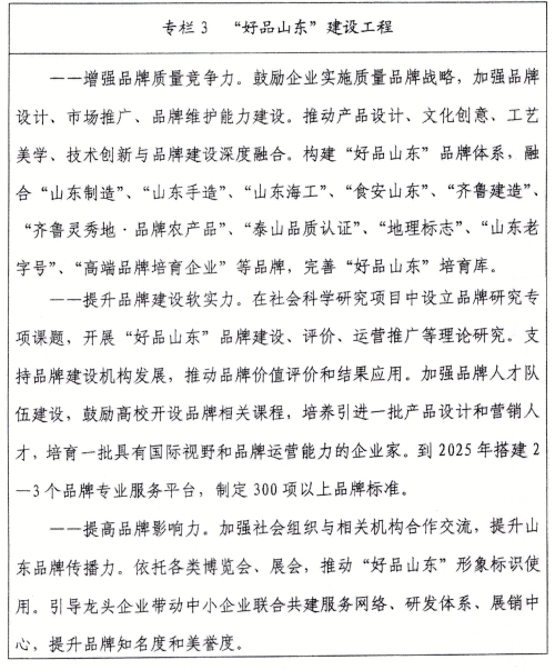 (十一)加快品牌體系建設。建立市場主導、政府推動的品牌發(fā)展機制,激發(fā)市場主體創(chuàng)建品牌的內(nèi)生動力,營造共建共享的品牌生態(tài)環(huán)境。加快構(gòu)建以“好客山東 好品山東”品牌為主體、各類品牌為基礎的山東品牌體系。實施品牌筑基工程,發(fā)揮企業(yè)、行業(yè)協(xié)會作用,孵化品牌群體。實施品牌培育工程,對各行業(yè)部門依據(jù)法律法規(guī)、政策和品牌建設相應技術標準產(chǎn)生的品牌,納入“好品山東”培育庫融合發(fā)展。堅持分類指導、梯次培育,一體推進技術、標準、質(zhì)量、品牌管理創(chuàng)新,打造自主創(chuàng)新、品質(zhì)高端、信譽過硬、市場公認的“好品山東”好品庫。實施高端品牌引領工程,鍛造一批優(yōu)勢明顯的品牌精品。積極爭創(chuàng)中國質(zhì)量獎,持續(xù)開展省長質(zhì)量獎評選活動。
